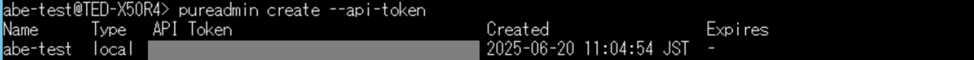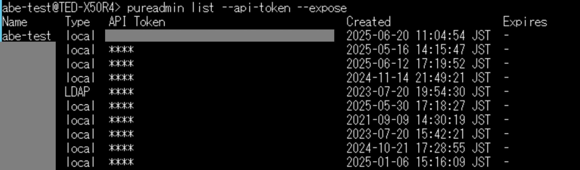 作成したAPIトークンを確認するコマンドは下記の通りです。なお、この時ほかのユーザーのAPIトークンは自動的にマスクされ、確認することはできません。