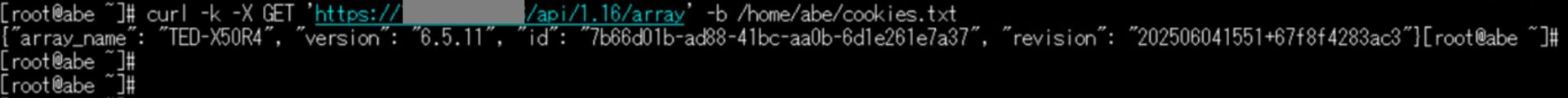 認証後に得られたセッショントークンをAPIリクエストヘッダに含めることで、以降の操作が可能になります。以下は、ストレージアレイに関する情報を取得するリクエストの例です。