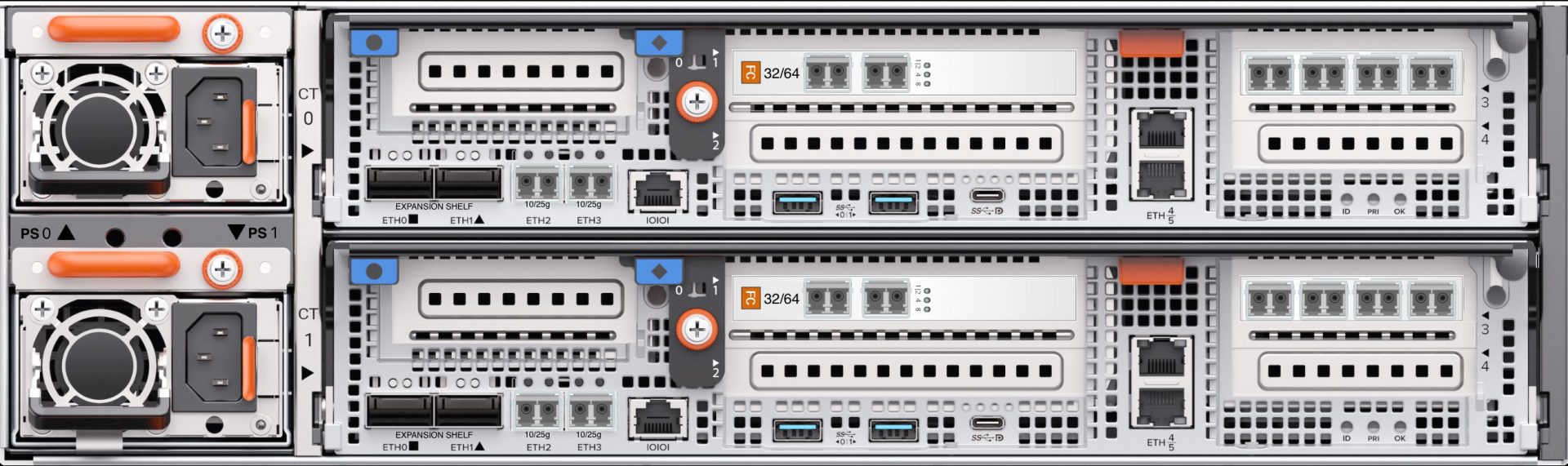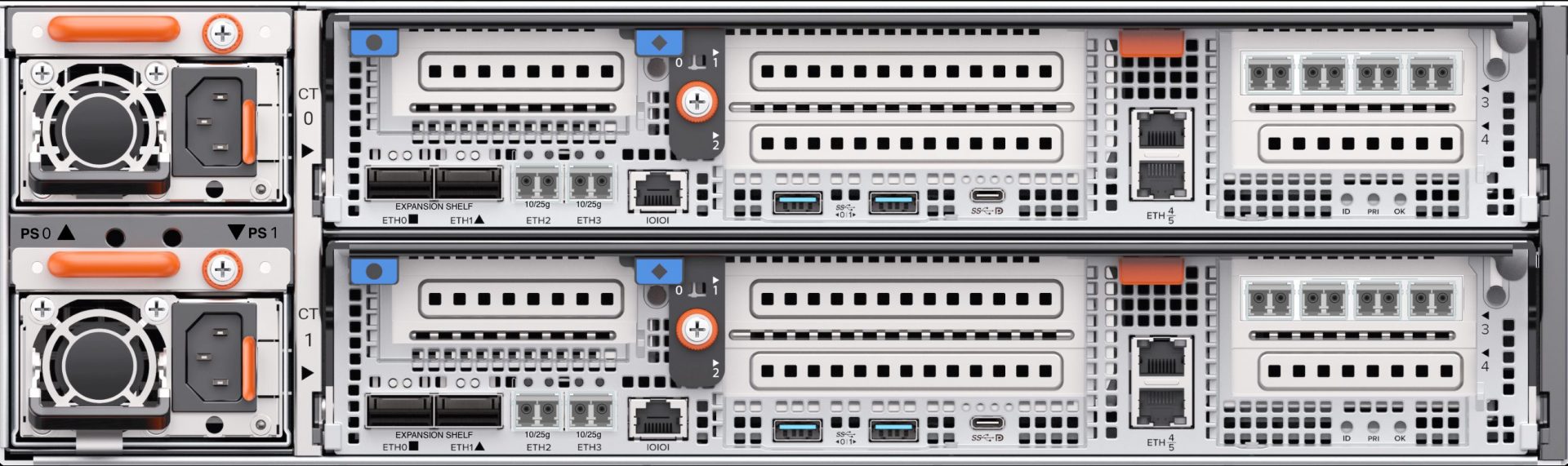 背面は従来のXR5やCR5シリーズと同様となり、左に電源モジュール(PSM: Power Supply Module)が2個と、コントローラ(CT: Controller)が2個搭載されています。電源は200V(IEC320-C14 ⇔ IEC320-C13:ラックの電源はC14を使用する形)で稼働します。CTの中にIOモジュールが搭載可能となり、FCやiSCSI通信が可能になります。