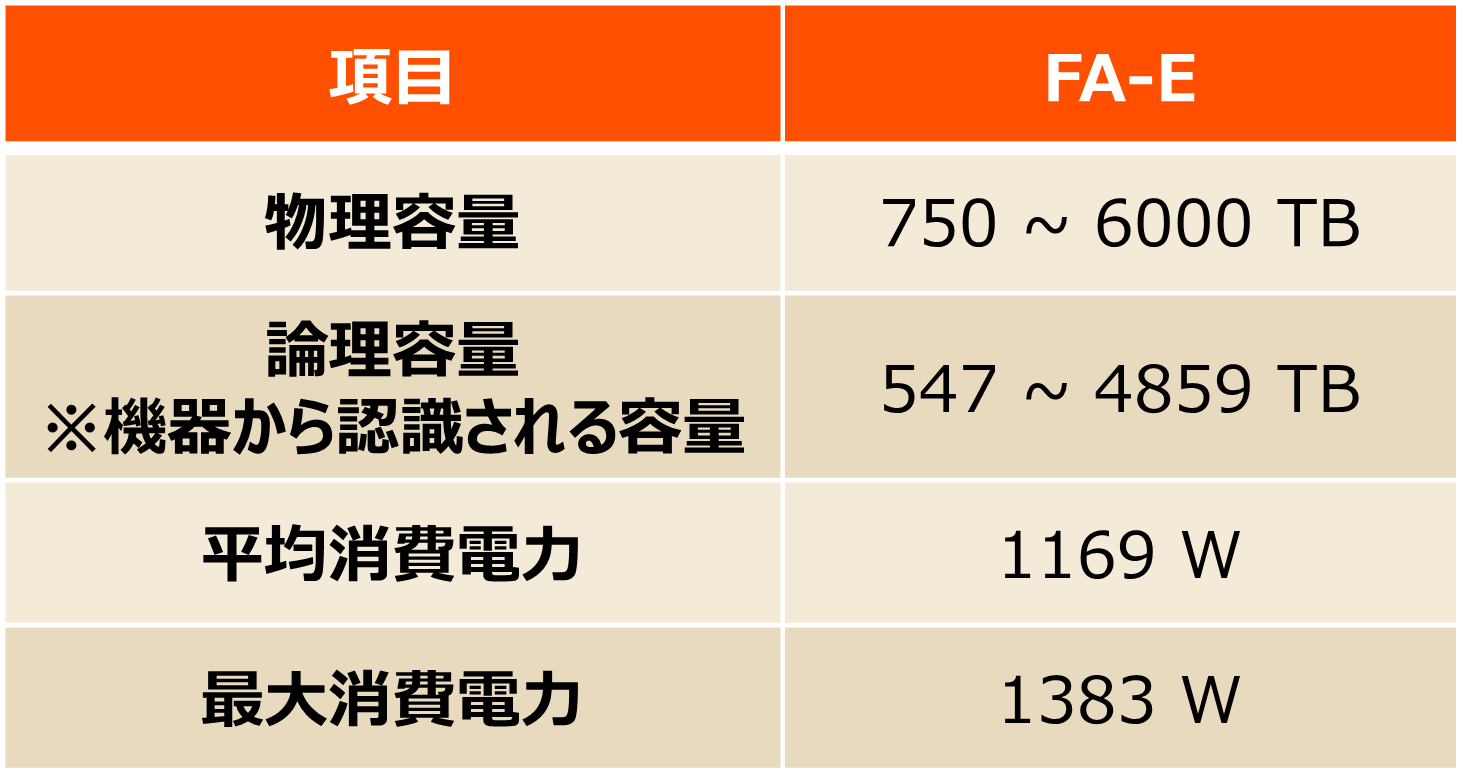Eシリーズに搭載できる容量や消費電力は、下記のとおりです。