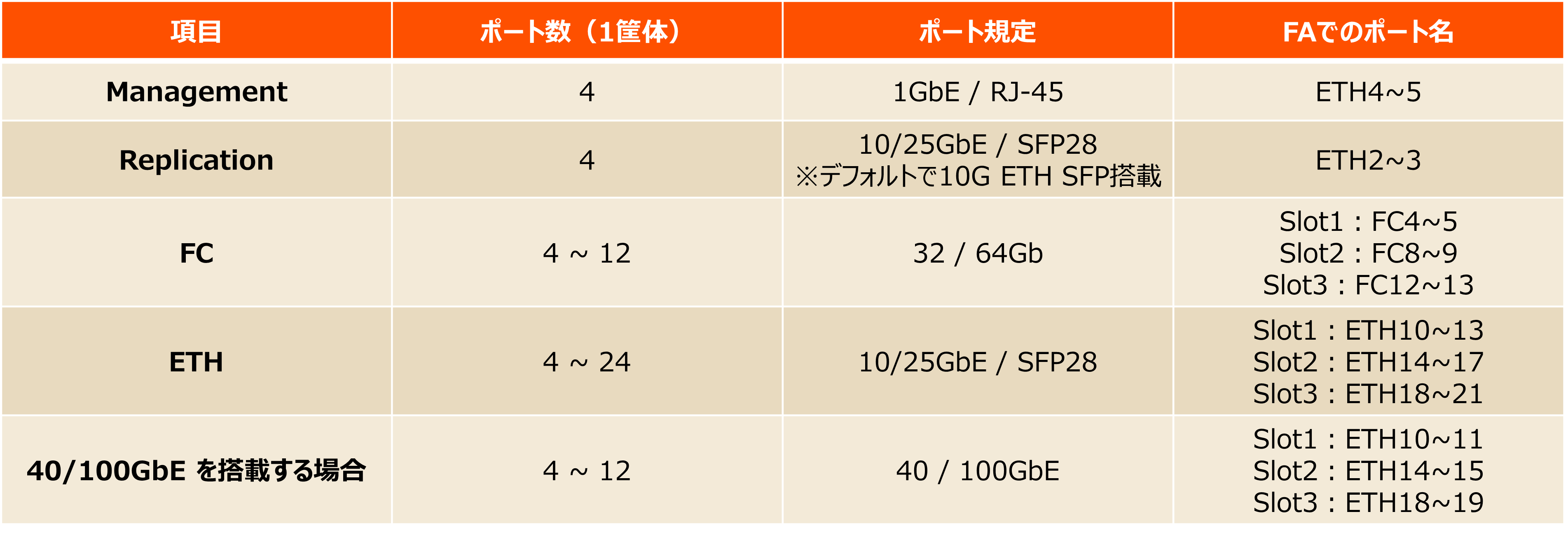 ETHポートは、追加するNIC(Network Interface Card)を10GBASE-Tに変更して、通信することも可能です。また、HBA(Host Bus Adapter)を追加することで、FCでもご利用いただくことが可能です。