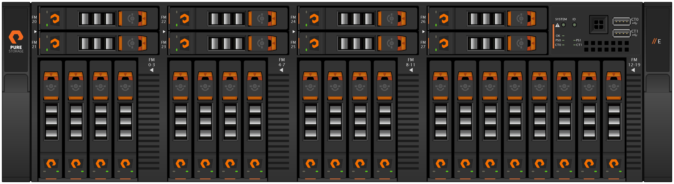 FA-Eの前面と背面の図を下記に記載します。前面には、DFMe(DirectFlash Module、末尾のeはEモデル用であることを表現)と呼ばれるEverpure(旧:Pure Storage)社独自のDriveが搭載されており、筐体には最大28本分のDFMを搭載できるつくりとなっています。FA-EのDFMeは、上記XR5シリーズの詳細にてご紹介したDFMD(DirectFlash Module Distributed NVRAM)の機能を有しており、各DFMへNVRAMを分散して搭載するアーキテクチャが採用されています。そのため、XR4やCR4シリーズの構成のように独立したNVRAMモジュールは搭載されておらず、前面にはDFMeが搭載されるのみとなります。