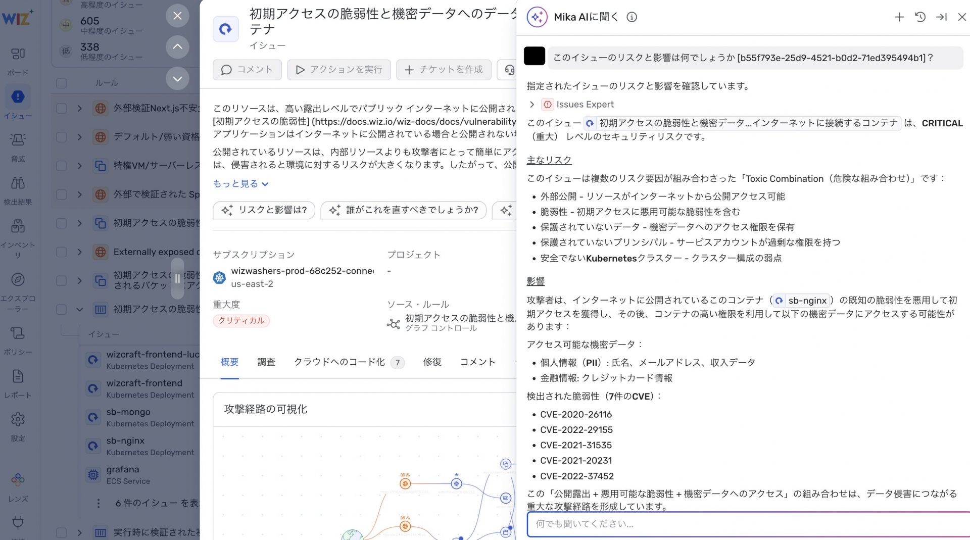 クラウド環境では、脆弱性・設定不備・アイデンティティ・データといった様々なリスクが複雑に絡み合いますが、Wiz ではそれらを「Issue」として一つの単位にまとめてくれます。そのうえで、各イシューの画面に