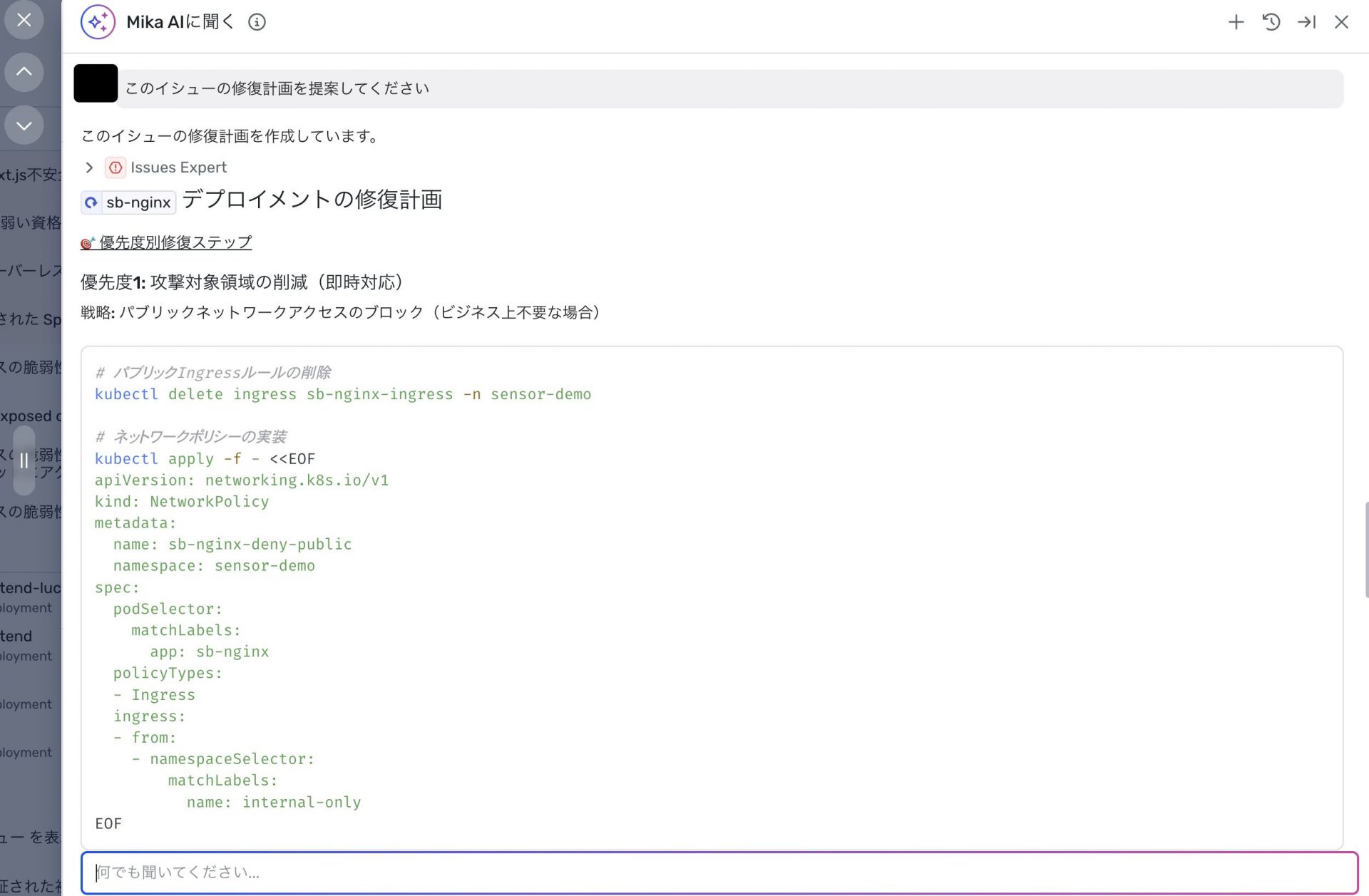 この「調査」「修復手順」のガイド部分は、単なる静的なヘルプではなく、AI を活用した補助も組み込まれており、状況に応じた具体的なアクションを提示してくれます。セキュリティの専門家でなくても、画面の流れに沿っていくことで「次に何をすればよいか」が自然と分かる設計になっている点が、使いやすさにつながっています。