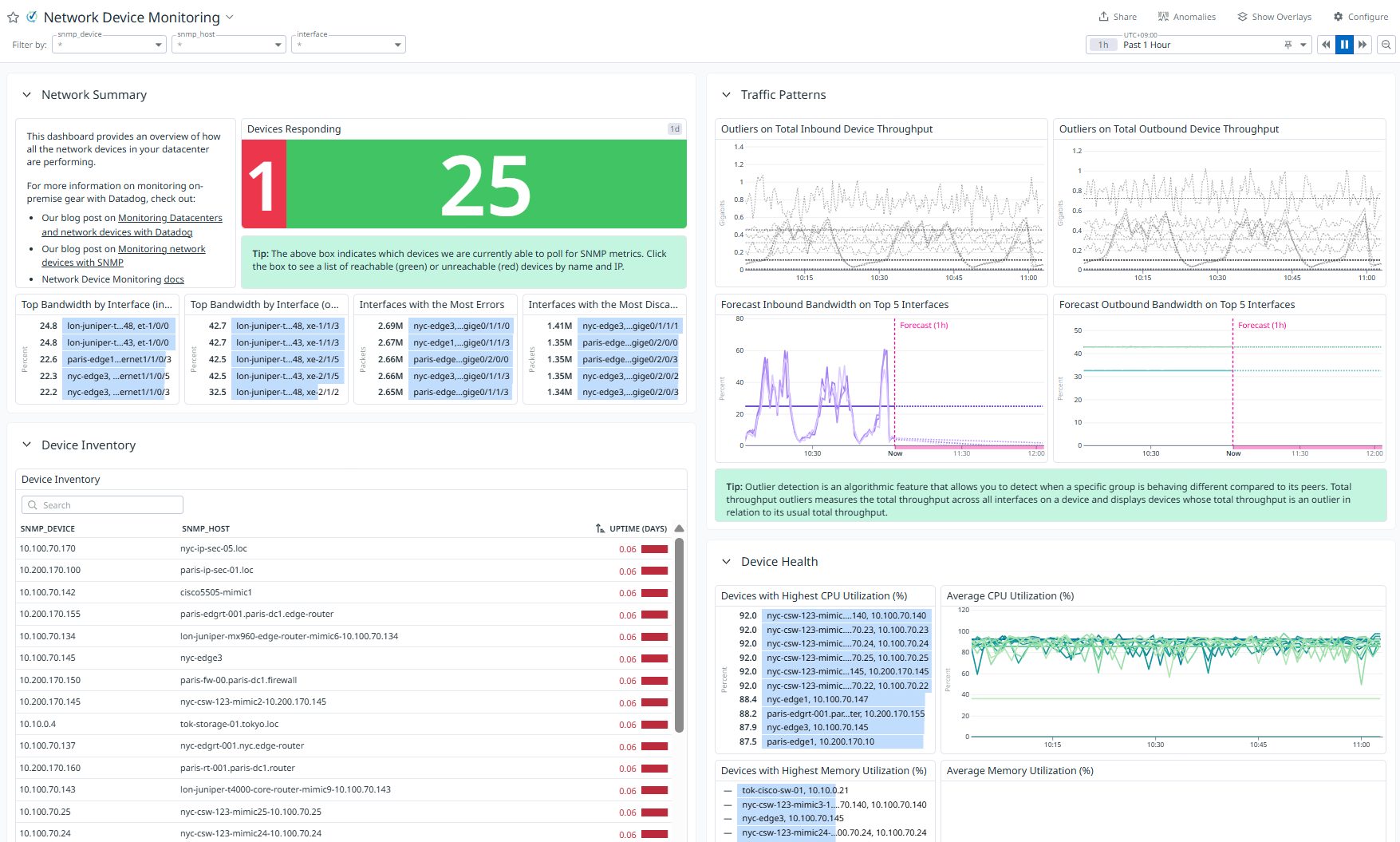 ルーター/ファイアウォールなどのネットワーク機器について、帯域・エラー・CPU/メモリなどの状態を一画面で可視化します。これにより、回線増強や機器更改の判断材料となるボトルネックを含めたトラフィック傾向の把握や、再起動・リンクダウンといったイベントの早期検知に役立ちます。