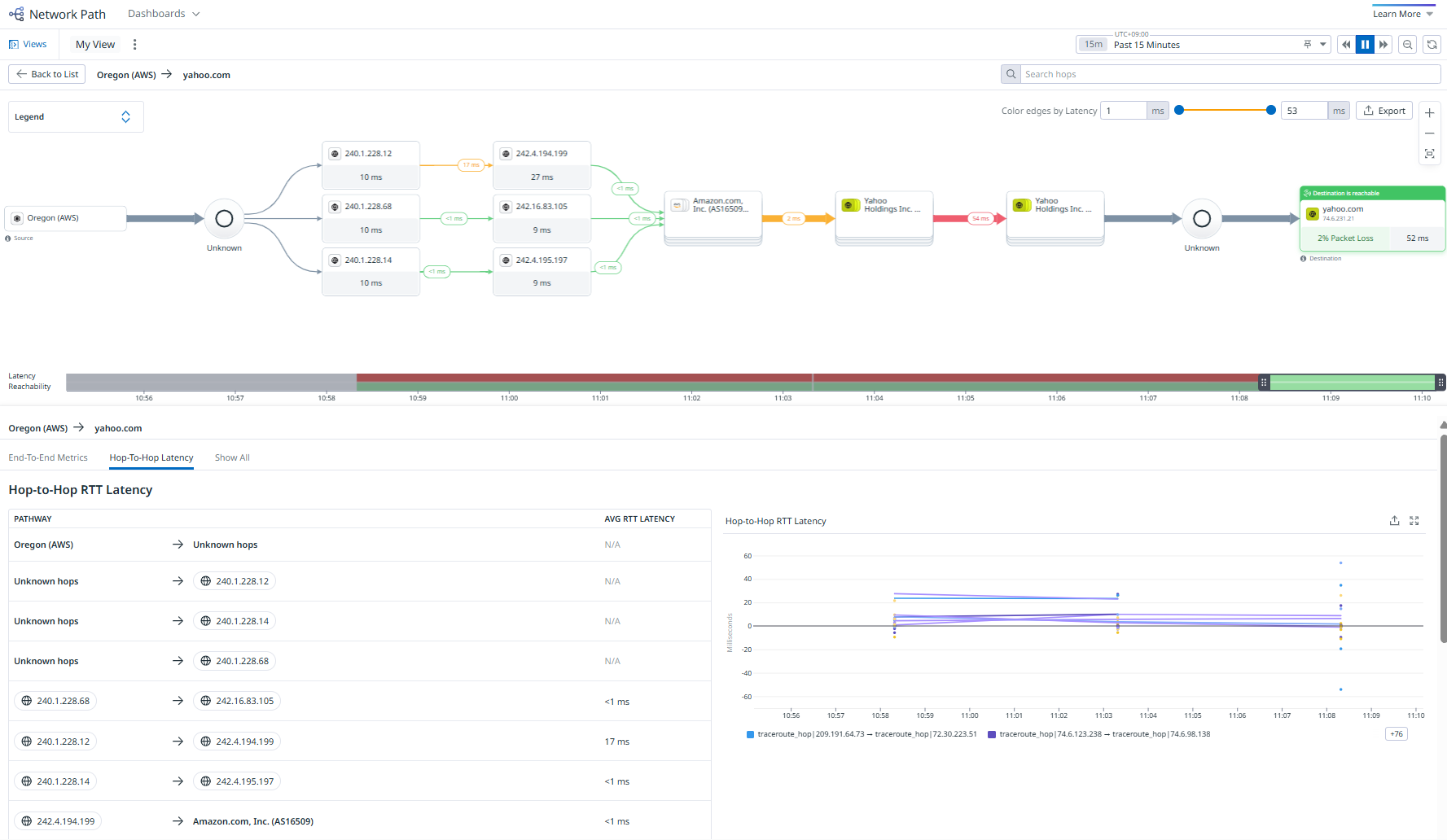 クライアント~アプリ間の通信経路をホップごとに可視化し、どの区間で遅延やパケットロスが発生しているかを把握できる機能です。これにより「結局どこが悪いのか?」というトラブルシュートの切り分けを大幅に短縮できます。