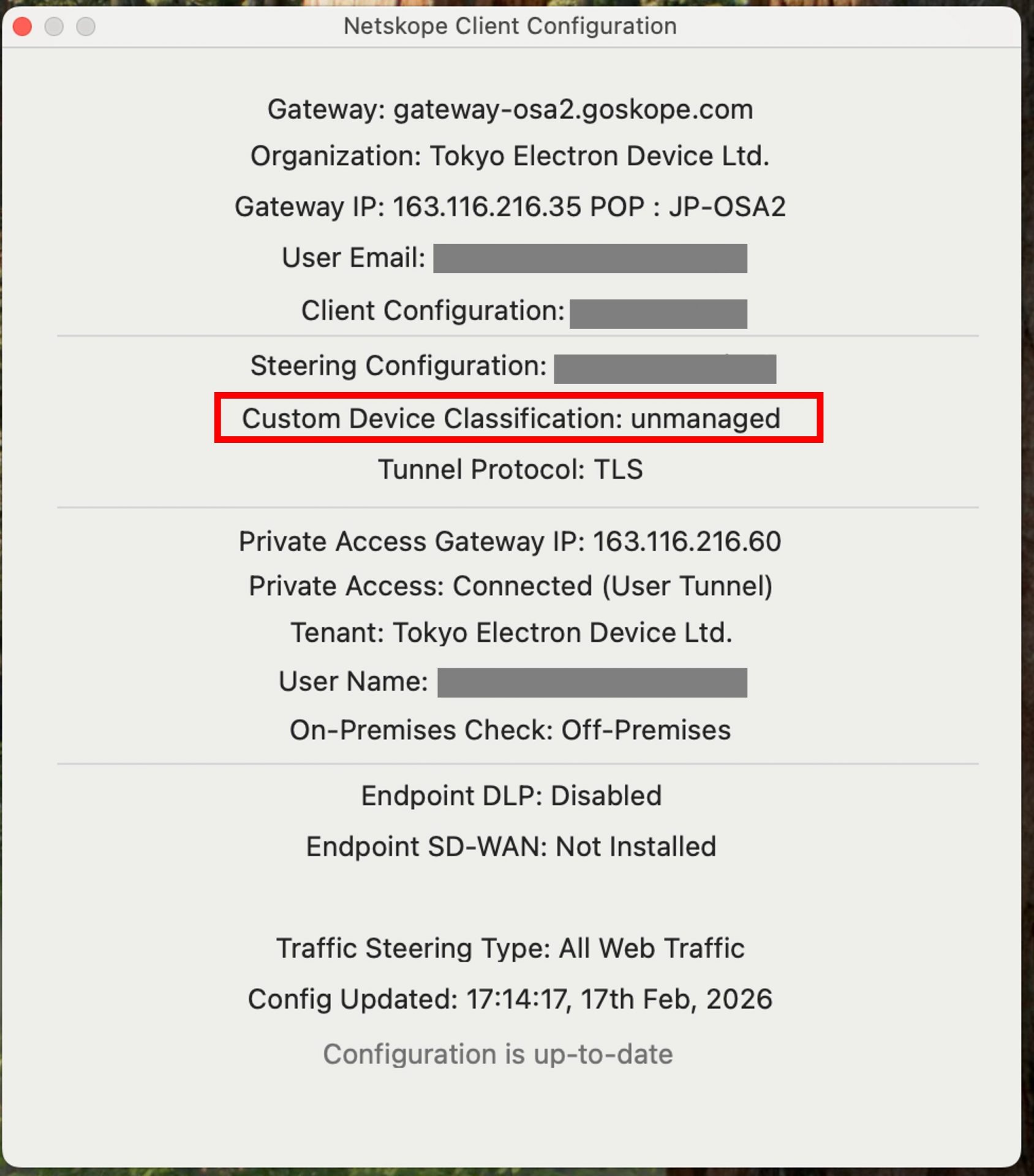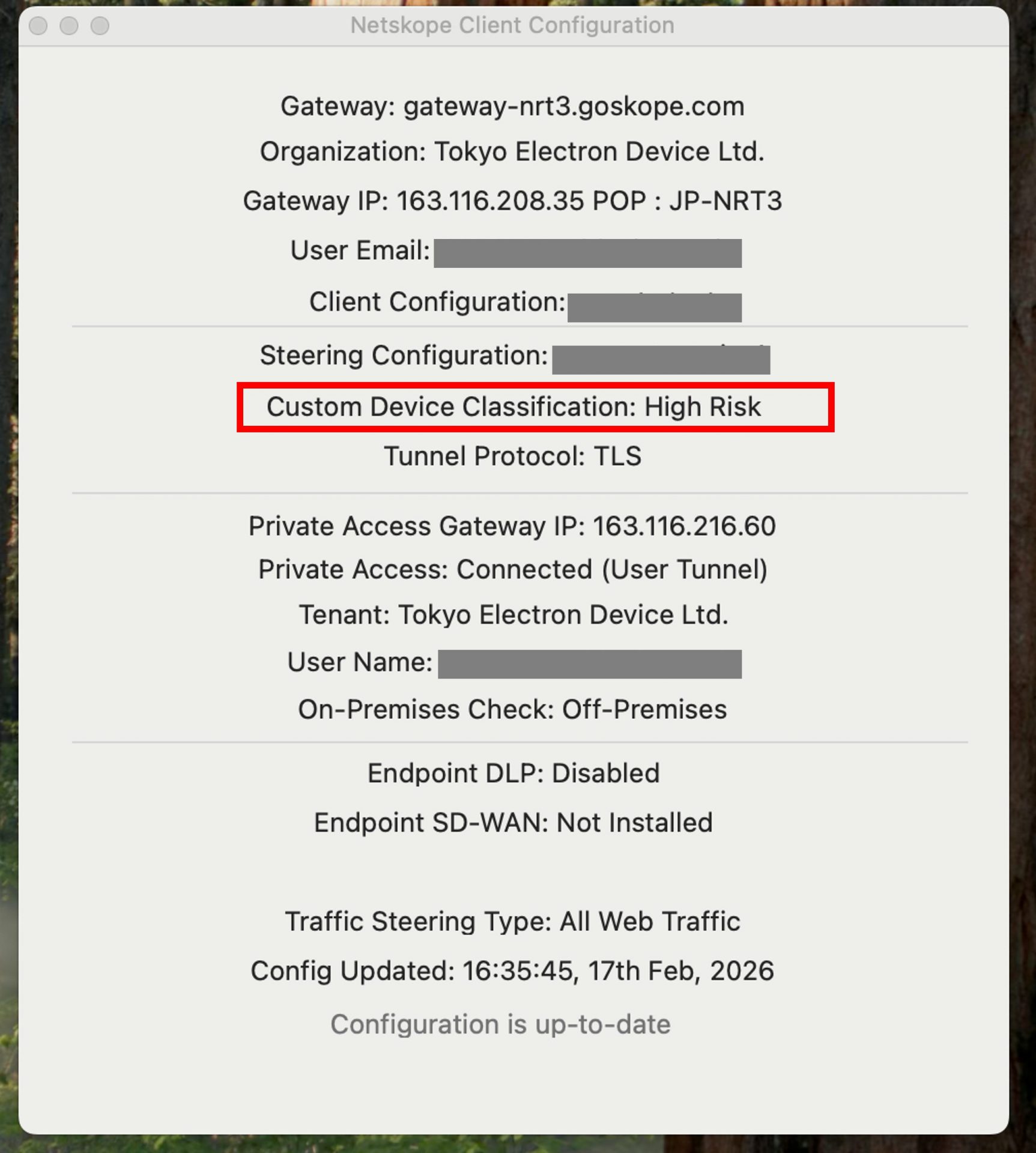 暫くして設定が端末に反映されると、端末のNetskope Clientアイコンを右クリックし、「Client configuration」を押しますと表示されるポップアップにて以下のような表示がされます。