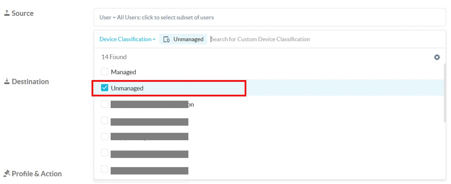 Device Classificationの項目で作成したカスタムラベルを選択できるため制御対象としたいカスタムラベルを選択します。