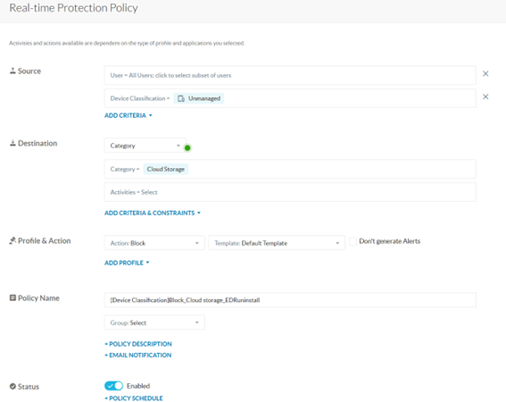 以下の例ですと、SentinelOneがインストールされていない端末(Unmanagedと判断されている端末)のクラウドストレージカテゴリーへのアクセスをブロックする。といったポリシーを作成しています。