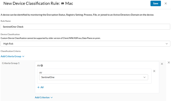 Rule Nameで任意のルール名を指定し、Device Classificationで先ほど作成したグループ「High Risk」を選択、さらに下の「Add Criteria Group」を押下し「AV」から「SentinelOne」を選択し「Save」で保存します。