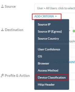 Policies > Real-time Protectionページの『NEW Policy』から新規ポリシー作成画面に移ります。Source項の「Add Criteria」からDevice Classificationを選択します。