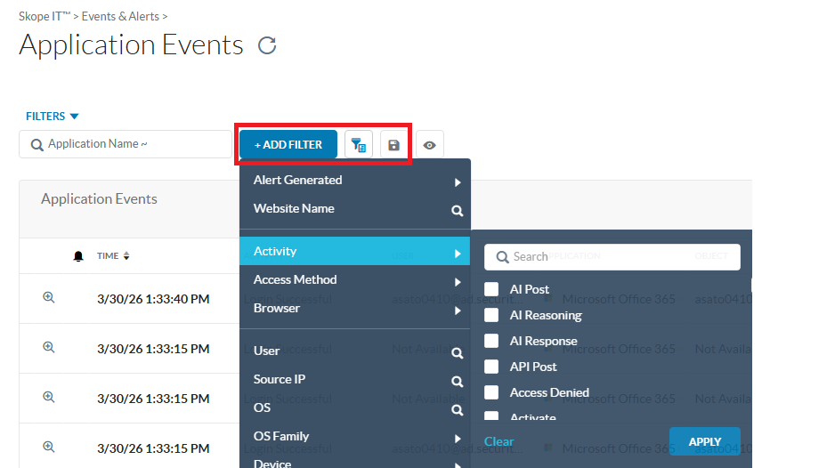 管理テナントのSkope IT > Application EventsからNetskopeご利用ユーザーがどのようなアプリにアクセスしたか、またどのようなアクティビティを実行したかを確認できます。