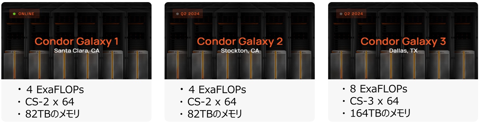 Condor Galaxy は、CS-3システムを複数台で構成したシステムで、アメリカのカリフォルニア州・テキサス州に設置されています。このCondor Galaxyを利用することはAIモデルを構築する最も簡単かつ最速の方法です。