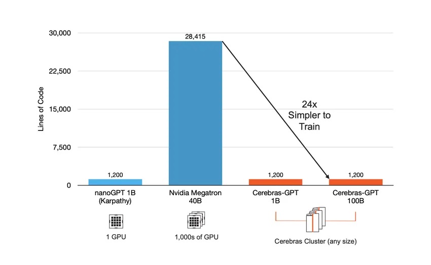 Condor Galaxyはウェハ―スケールクラスタで構成されているため、1台のシステムとして利用することが可能です。そのため、従来のGPUクラスタシステムで必要だったクラスタに関するプログラミング無しでAIモデルのスケールアップが簡単に実行できます。
