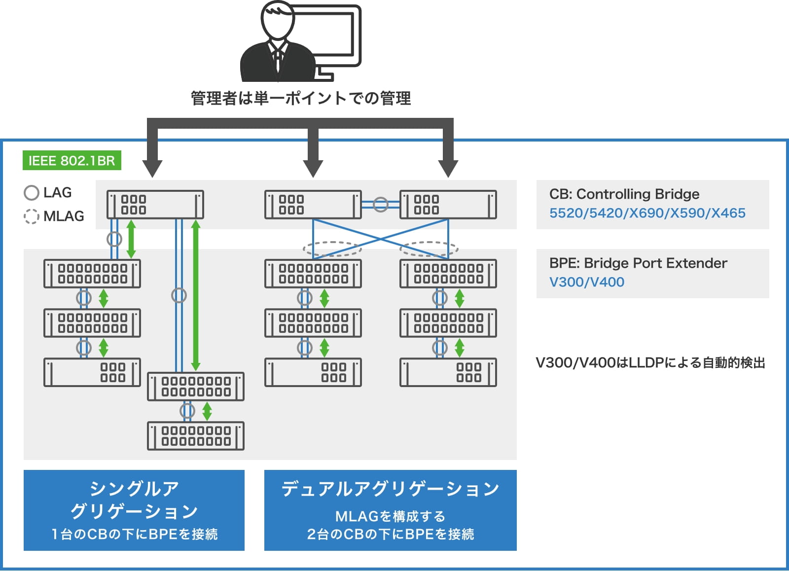 ExtremeSwitching EXOSシリーズは、IEEE802.1BR に準拠するExtended Edge Switching(別名:Virtual Port Extender)をサポートします。Extended Edge Switching は、ExtremeSwitching V300/V400シリーズと連携することにより複数のスイッチを論理的に単一のスイッチとして動作し、ポート拡張や導入・運用コストの削減を実現します。