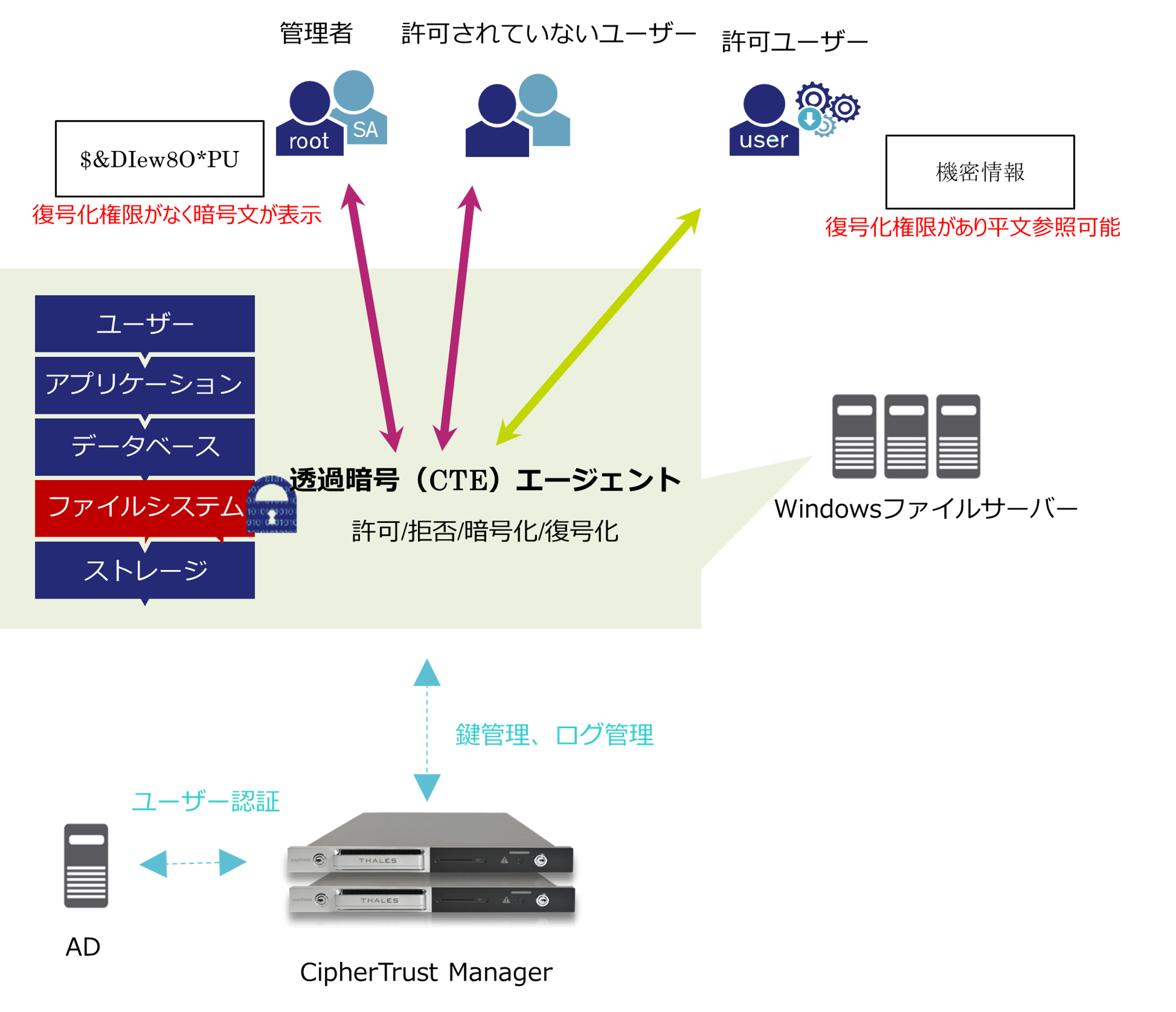 Thales社CipherTrust Managerでファイルサーバー上の各種ファイルの透過的暗号が実現できます。